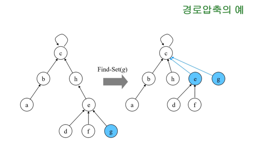 3) Find-Set은 재귀적을 대표노드를 찾아주는 함수이기 때문에, 노드 g에서 대표노드까지 올라가는 과정에
