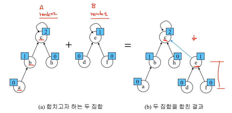 두집합을 합칠 때 랭크가 낮은 집합을 랭크가 높은 집합에 붙인다.