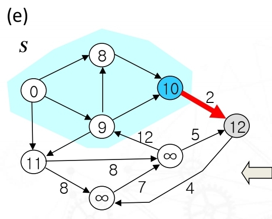 그리고 extractMin함수를 사용해서 10이 가장 작음으로 업데이트 된 노드 10을 S에 포함해주고 노드 10을 기준으로 잡는다. 노드 10과 인접한 노드는 하나 뿐이며 이완 조건에도 충족하므로 vertex 12로 업데이트해준다.
