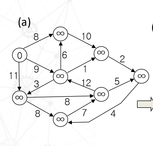 vertex 19은 이완조건 [vertex 9 + weight 1] <18 에 성립하기 때문에 10으로 업데이트 해준다. 나머지 노드는 성립하지 않기 떄문에 그대로 놔둔다.