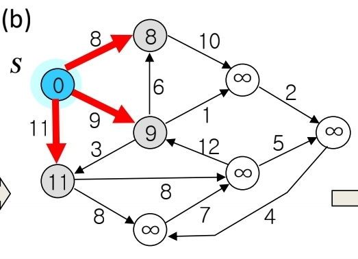 인접노드느 S에 포함되지 않고, [vertex 8 + weigt 10] > ∞ 이 성립하기 때문에 인접노드를 18로 업데이트 해준다.
