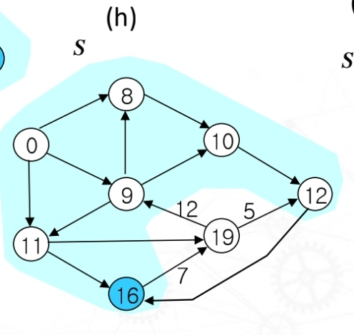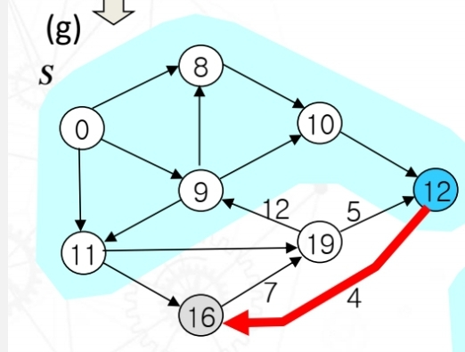 이제 다시하번 이완된 노드들 중에서 가장 작은 노드 12를 S에 포함해주고, 기준으로 잡아준다. 기준과 인접한 노드를 이완해주는데 이완 조건이 성립하게 된다. 따라서 vertex19에서 vertex16으로 업데이트 해준다.