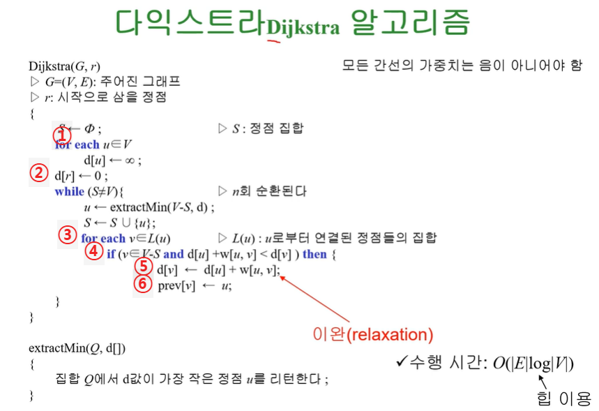 ② while(S≠V){}모든 Vertex에 대해서 r로부터의 거리가 계산이 되었다면 끝낸다. 조건에 만족하지 않는다면 S집합에 Vertex하나씩 추가해준다. u←extractMin(V-S,d); S집합에 포합되어있지 않는 V집합 중에서 d가 가장 작은 값을 u로 지정해준다. 이때 많은 사용자들이 extractMin을 구하기 위해서 for문을 사용하게 되는데 그렇게 되면 이중 for이 되어버려서 O(n²) 이 된다. 따라서 최소값을 구할 때는 우선순위 큐를 사용한 힙정렬을 사용해줘서 O(logn)이 될 수 있도록 한다. S←S ∪{u} 가장 작은 값을 S집합에 넣어준다.