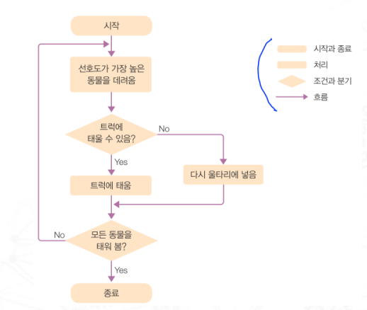 - 여러 종류의 상자와 상자를 이어 주는 화살표를 이용해서 명령 순서 를 표현