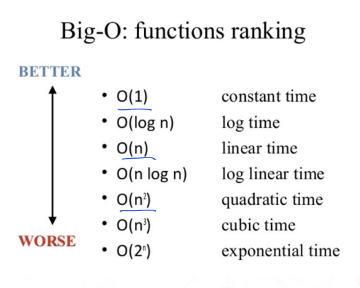 - 대표적인 함수는 O(1), O(log n), O(n), O(n log n), O(n2 ), O(n3 ), O(2n ) 정도가 있다.