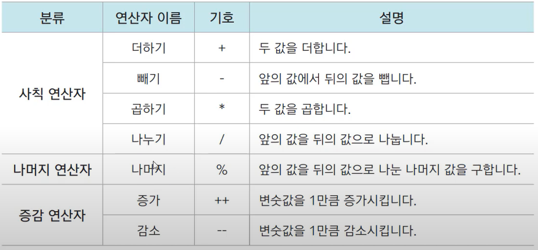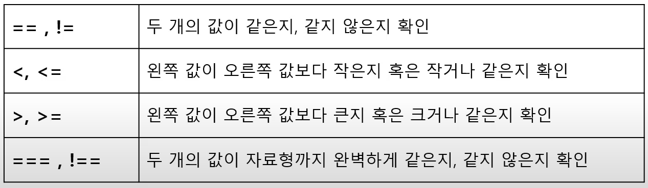 두 값을 비교하여 true나 false로 결과 값을 내놓는 연산자